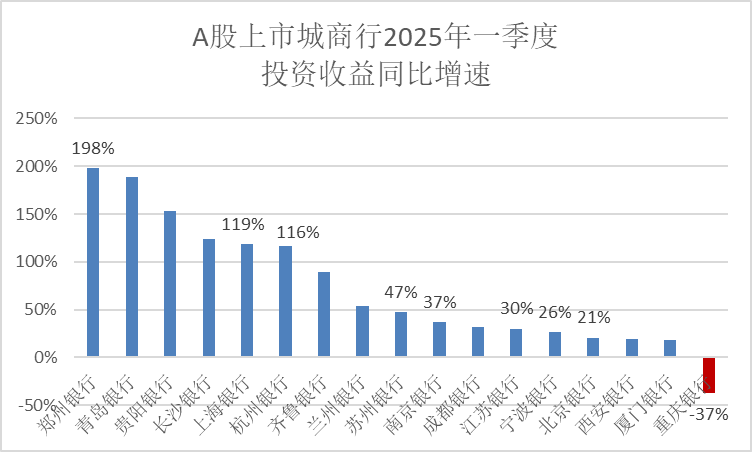 券商中国记者梳理Wind数据,今年一季度,A股42家上市银行中,有34家银行的投资收益实现了正增长,且包括光大银行、郑州银行、青岛银行、贵阳银行、建设银行、江阴银行、长沙银行、上海银行、杭州银行、邮储银行在内10家银行的投资收益同比增速超过了100%,其中光大银行以302.96%的增速登顶。此外,半数以上的上市银行投资收益同比增速在二成至九成的区间。
