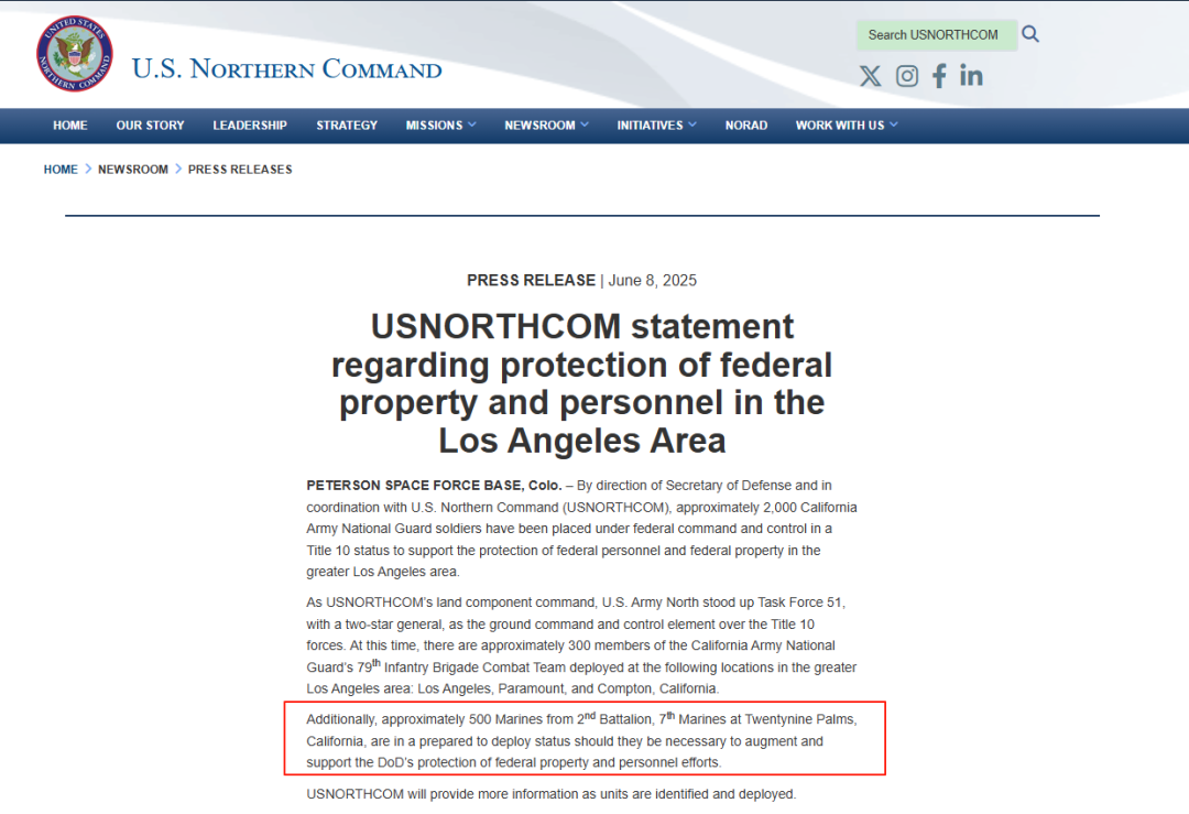 当地时间6月8日,美防长赫格塞思下令,经美军北方司令部协调,已有500名美海军陆战队员处于“准备部署”状态,随时可能被派往洛杉矶,协助应对当地因移民突袭行动引发的持续抗议活动。