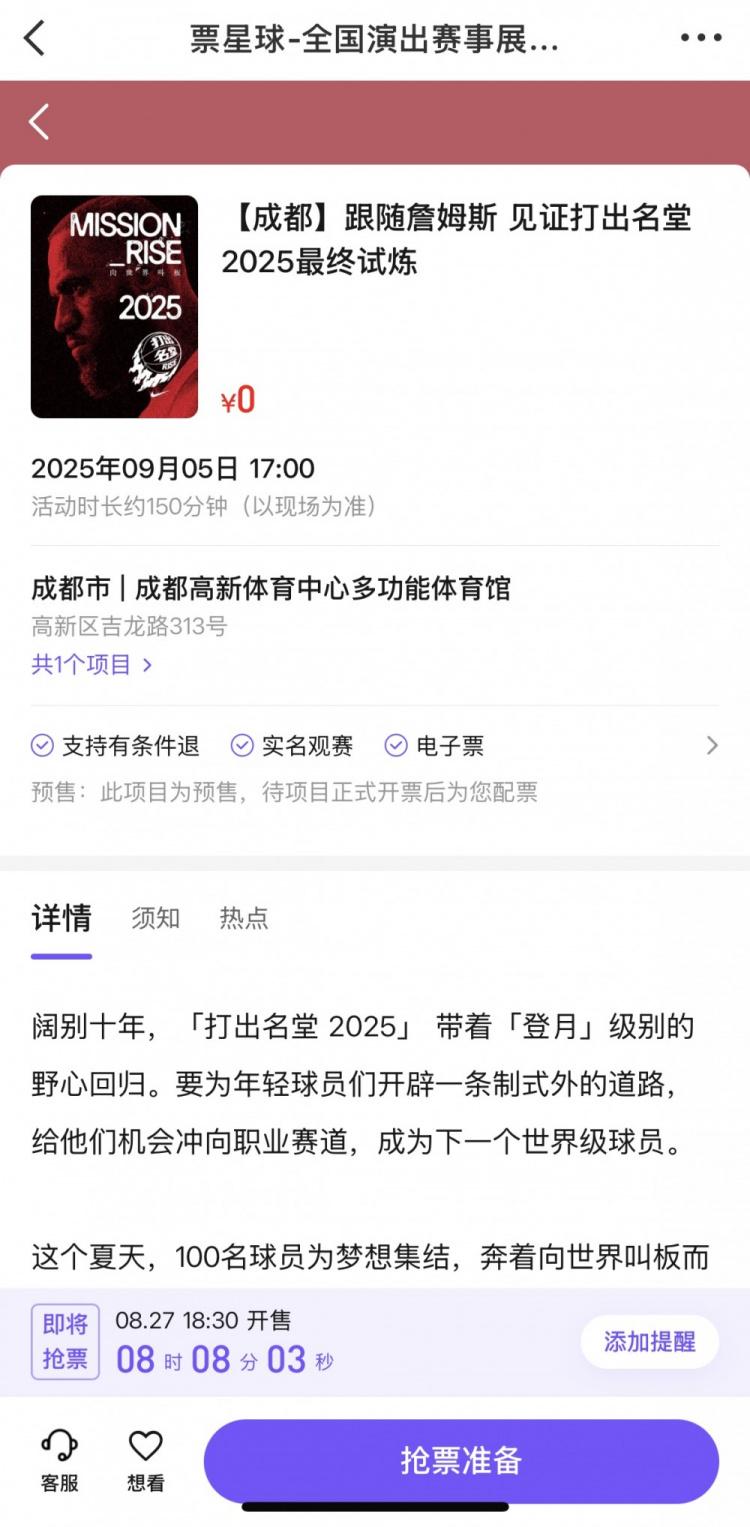 詹姆斯将于2025年9月5日在成都高新体育中心多功能体育馆出席打出名堂2025终局之战,活动开始时间预计为17:00,时长约为150分钟。